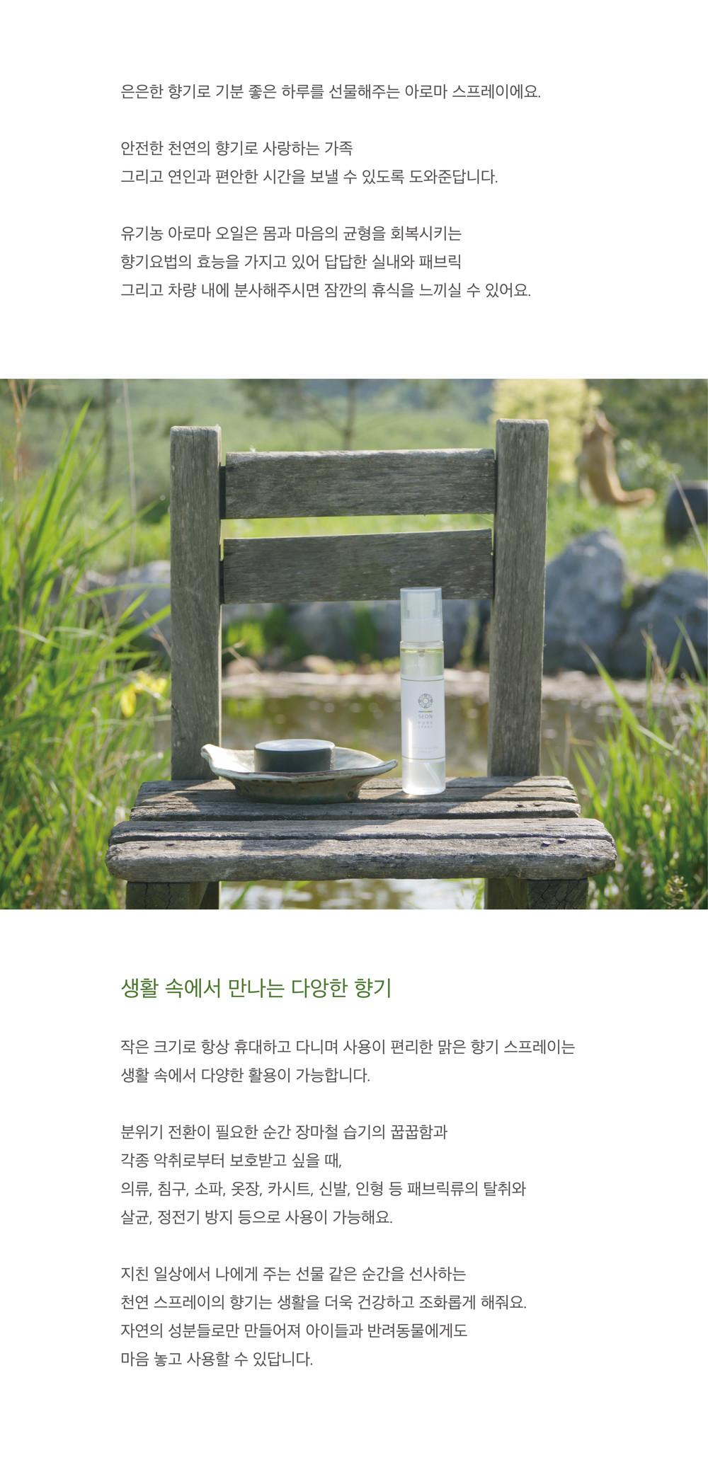 스프레이 공통 성분 : 보습제, 유기농 아로마 오일, 식물성 발효주정, 정제수